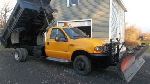 This is a f-550 !!!! not a f450..2000 F-550. Diesel, 11' Dump, 9' plow, 4x4, 6sp trans. 121k miles. Recent work done: Truck had an injector problem (1or2), I purchased 8 low mileage injectors (from an engine with 41k miles) and had 7 replaced (because I had them).Truck runs great. Also had water pump and thermostat done, driver exhaust manifold and a couple hydraulic lines. I believe that there was probably other things done i'd have to ask mechanic. Tires in great shape. There are some areas of rust on dump and some under drivers side cab (rockers still good) I purchased truck not too long ago but have since of lost interest in truck and I do not need a plow. I am looking to sell to get a larger volume Grain body dump. Jim 607-201-2534