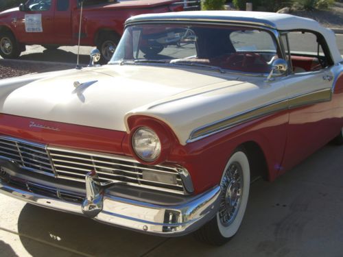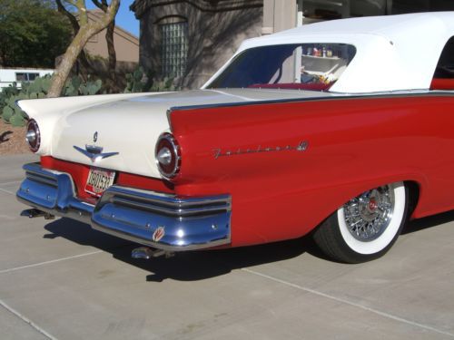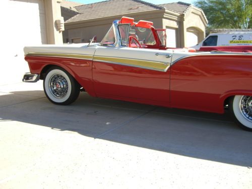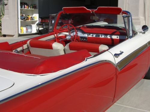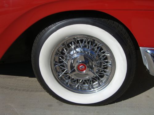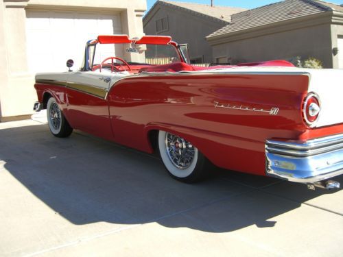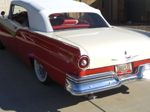 Frame-up restoration in Utah, completed in 2007 and driven little since. Correct Ford Flame Red and Colonial White colors in and out. Recently freshened with new convertible top and new chrome wire wheels/radial wide white tires. Rebuilt 312/4V engine, FordoMatic Trans, dual exhaust, power steering, front disc brakes, modern radio, Vintage Air Conditioning. Looks and drives super nice. Ready for show/tour.