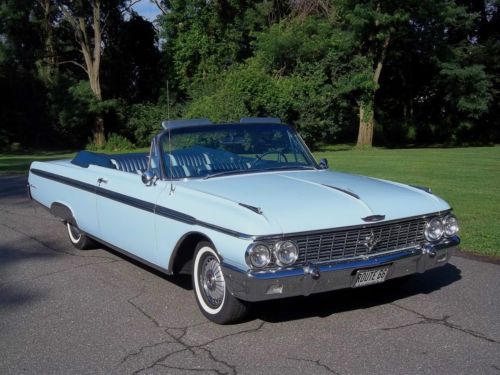BEAUTIFUL BAFFIN BLUE 1962 FORD GALAXIE 500 SUNLINER CONVERTIBLE. 352 FE BIG BLOCK V-8, CRUISE-A-MATIC AUTOMATIC TRANSMISSION, POWER STEERING, POWER BRAKES, AND POWER TOP. AND SPEAKING OF POWER TOPS, THIS ONE FITS BEAUTIFULLY, AND IN A MEDIUM SHADE OF BLUE OFFERS A STRIKING CONTRAST TO THE BABY BLUE EXTERIOR. THE INTERIOR IS A TRI COLORED BLUE VINYL WITH A PADDED DASH. DOOR PANELS HAVE A CHROME TAPE TRIM THAT HAS FLAKED IN SPOTS. EVERYTHING WORKS EXCEPT THE CLOCK. THE BODY OF THIS CAR IS RUST FREE. THE PAINT JOB IS MORE THAN 10 YEARS OLD AND STILL LOOKS NEW. CONVERTIBLE TOP WAS REPLACED ABOUT 5 YEARS AGO, ALONG WITH THE TOP WEATHERSTRIPING, HOSES AND TOP PISTONS. I HAVE ALWAYS GARAGED THIS CAR, AND IT SHOWS. CAR HAS FACTORY STYLE DUAL EXHAUST WITH MUFFLERS AND RESONATORS, FACTORY ACCESSORY FENDER SKIRTS, FACTORY ACCESSORY DUAL MIRRORS, FACTORY ACCESSORY DOOR EDGE GUARDS, FACTORY ACCESSORY HOOD ORNAMENT, AND FACTORY ACCESSORY BUMPER GUARDS. THE CHROME AND STAINLESS TRIM ARE IN EXCELLENT SHAPE. CAR RUNS AND DRIVES VERY WELL. BRAKES AND MASTER CYLINDER WERE REPLACED RECENTLY. THIS IS THE FIRST TIME I AM OFFERING THIS CAR FOR SALE, AND CARS THIS NICE DO NOT COME ALONG VERY OFTEN. I NEVER HAVE TIME TO USE IT, AND I FEEL IT SHOULD GO TO SOMEONE WHO HAS TIME TO ENJOY IT.  |