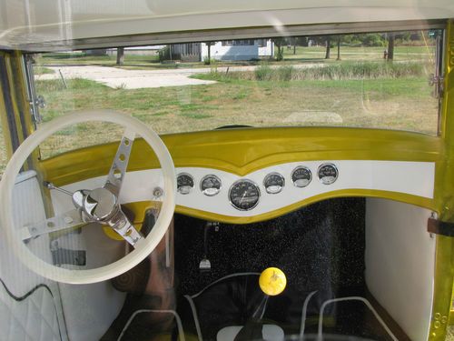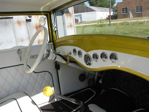 This is a 1931 ford model a (SOUR) built by Jeff Jones from Jones' Rods and Customs. The body has been chopped 3 inches and channeled 4 inches. The visor has been removed to have more of a ''32 style. The drip rails have also been removed to keep the body more smooth. The rear taillight section is crafted from a 1960 chevy that has been shortened to fit the rear. There is also 122 louvers punched in the deck lid. The paint is a candy concentrate from SEM called sundance yellow. It is over a galaxy silver. The color varies in the different light from gold to yellow to a limeish green. The frame is hand crafted from 2x4 square tubing 3/16 thick. All the suspension was ordered from TCI. The front is a dropped straight axle with hairpins. The rear is a ladder bar with coil overs. The drivetrain is a 1951 flathead with a 91 s-10 t-5 transmission. The rear end is also from the same s-10 truck. There is a new aluminum radiator up front along with two new water pumps to keep this running a cool 150 degrees. The heads, intake,carbs are all new. The interior is all custom hand made panels with a bright white vinyl diamond tuck. The seat is from a caravan that has been refoamed and shaped for a custom look. All of the interior was done by Mike Lawson from Kustom Image Uhpolstery.