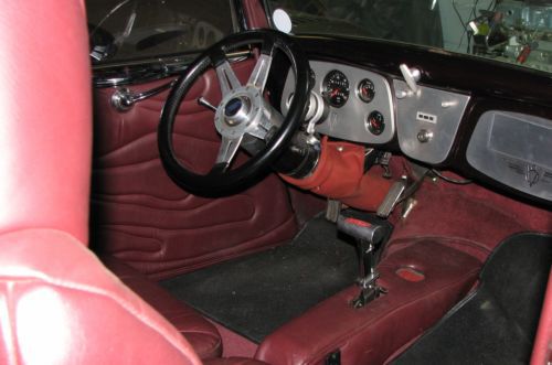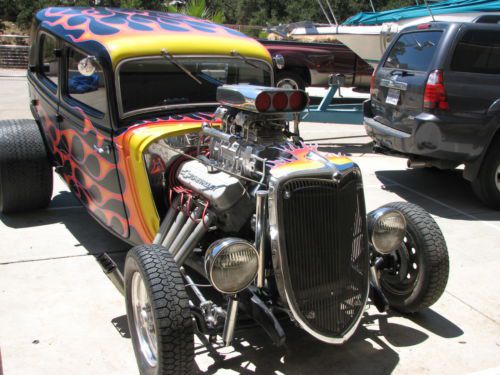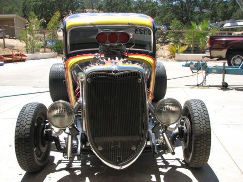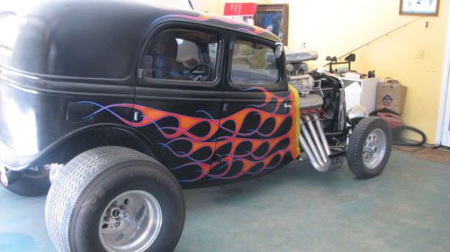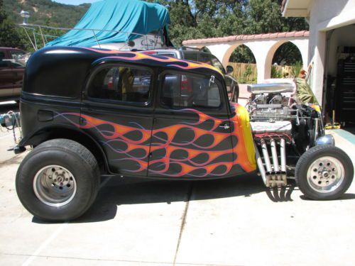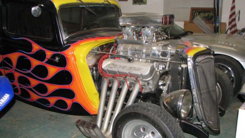 see condition description car is very fast in excellent condition mechanicaly perfect no flaws ,slight wear on rear tires,solid weld racing wheels Paint is in nice condition no laquer. front headlights are super king bees.tails are traditional 1934 ford rear lights willwood dsic brakes,sharp black paint with orayellow fading to orange flames with blue trim,Alpine cd and multidisc changer with 200 watt amplifierHigh tech QAL gas assisted fully adjustable shocks,that give it a very smooth ride.The car has a comfortable ride yet can pull lots of power on demand. I invite any inspections and is a must see does 165 miles an hour at a ten second quarter mile,clocked by chp on Malibu freeway ,cruizes on the highway at 70 mph at 3000 to 4000 rpms depending on overdrive switch on or not very smothly not a bumpy by anmy means. Roller motor is built by west coasts engins is fully balenced and has a 2000 pound stall converter and is well designed to last and is not a race or drag car but very nice highway cruiser, The best part of the car is it is an origional california title so everything is streetworthy.The front fourlink is rolled back 15 degrees camber and handles very well.The guages are five VDOs and well lit call for further info at 805-462-8152 |