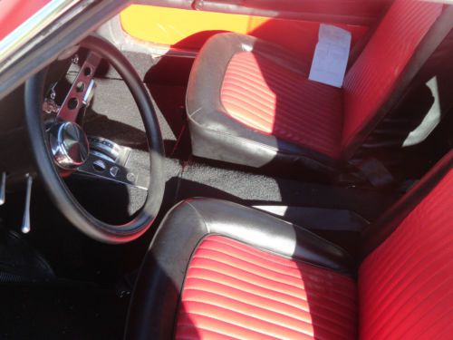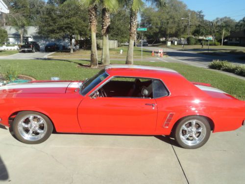 1969 Mustang Coupe: This Mustang is almost restored. It has a 302 V-8 engine and c-4 transmission (rebuilt). There is absolutely no rust in this car. If there was any it was cut out and replaced with new metal. I have put in a Mustang 2 suspension w/rack and pinion and a new wiring harness. The seats were reupholstered (red and black) and new head liner was installed. There is also a new Ford dashboard, tilt steering wheel, new classic air condition and 17"torque thrust 2 rims and tires. The Mustang was painted fire engine red with 2 white stripes and has several clear coats. This car only needs a few things to make it a completely restored car. 1) door glass on both sides needs to be adjusted. 2) the door molding on both sides needs to be removed along with the glue and new moldings attached.