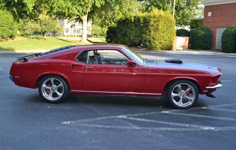 EMAIL : heopmilesarther@mail.com 1969 Ford Mustang Mach 1 428 Cobra Jet was built on November and is finished in Candyapple Red over a black interior. The car was refurbished with work including a repaint in red, an engine rebuild, a transmission swap, a disc brake system install, and interior upgrades. Power comes from a replacement 428ci V8 mated to a Tremec T56 six-speed manual transmission, and equipment includes :18" Billet Specialties wheels, a Ram Air hood scoop, a rear wing, rear window louvers, a Vintage Air air-conditioning system, and an Ididit steering column. Maintenance in August 2020 included an oil change.