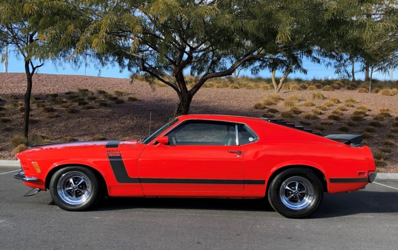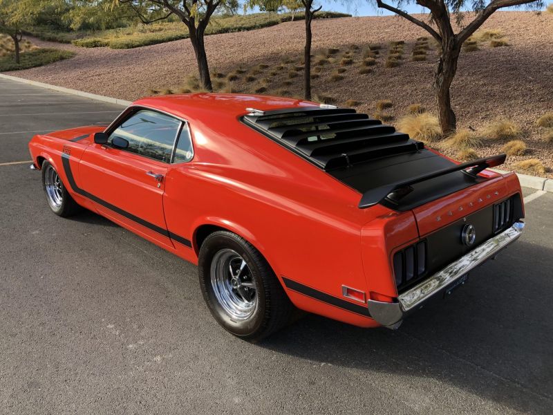 No call please. e-Mail : marklaborde89@gmail.com This 1970 Ford Mustang Boss 302 with the exterior in Calypso Coral Orange and replacement of the 302ci V8. Additional modifications include installation of a Holley carburetor, an electronic ignition, LED dashboard lighting, auxiliary gauges, a woodgrain steering wheel, and an aftermarket radio. Power is sent to the rear wheels through a four-speed manual transmission and a Traction-Lok differential, and equipment consists of power-assisted brakes, Magnum 500-style wheels, rear window louvers, and front and rear spoilers.