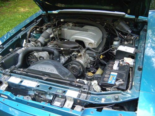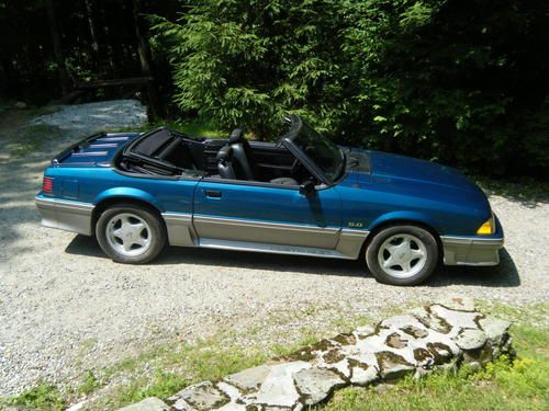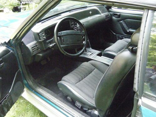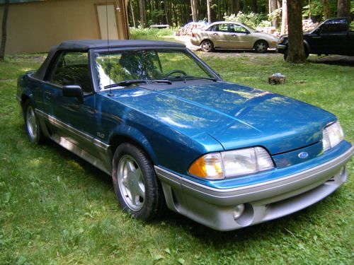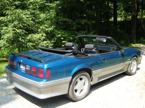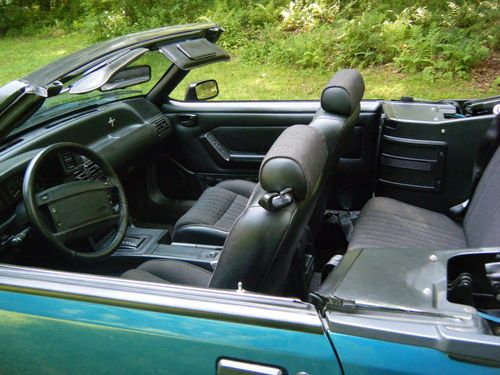 Offered is a 1993 Ford Mustang GT convertible. This is a one-owner car that has never been driven in the rain or snow, and has been garaged since it was new. The color of the car is actually a turquoise color, with factory paint in fine condition. This car has had no body or mechanical repair. It only has 9000 miles on it, with the original top and original tires and original exhaust system. The car has never been to a dealership as I have always changed the oil myself. Everything works, with the exception of the air conditioning, which has lost its charge after 20 years. The car has an automatic transmission and an impeccable cloth interior.