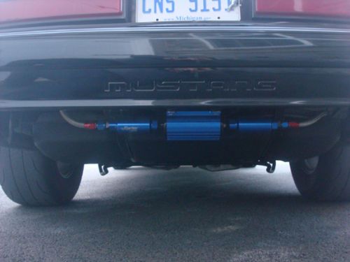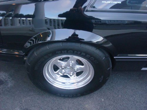 To start the rebuild process the engine, transmission, and rear axle were removed.  Most of the rear body seams and torque boxes were fully welded rather than just spot welded.  They are still in great shape today.  The engine compartment and inner front end were painted the stock black color (base and clear) so it would match the exterior of the car.  The side mirrors were also painted at the time so they are no longer flat black.  The car already had the ghost flames you see in the pictures and the rear of the car remains the original paint.  A 1993 OE Ford Special Edition wing is also installed on the rear of the car.  All new OE front window trim, seals, and drip rails were purchased from Ford and installed.  The stock headlights were replaced with one piece units which give the car a smoother look.  The rear taillights were replaced with brand new OE Ford lenses.  The original matching numbers engine was then rebuilt with the components listed below.  The car still has power steering but no longer has air conditioning or cruise control.  Several transmissions combinations have been in the car and the latest C4 detailed below has less than 100 miles on it.  A custom made a race shifter mount is installed so that it could be mounted in the stock location with no console modification.  It uses a manual boot rather than an automatic but looks like it came from the factory that way.  The rear end was replaced and was rebuilt again less than 1,000 miles ago due to a bad u-joint.  A brand new aluminum driveshaft was also installed at the last rebuild.  The rest of the suspension was rebuilt with mostly new urethane bushings and hard parts during the original build.  The car features a four wheel disc brake conversion as well as all custom front stainless soft and hard brakes lines.  There are no longer any brake lines running across the top of the engine compartment which makes for a much cleaner look.  The interior of the car is mostly stock however an aftermarket radio, speakers, and several aftermarket gauges were added.  The map pockets on the door panels were removed as they tend to stretch over time.  Unlike most Fox Mustangs, the ash tray door works, the arm rest latch works, and all items function as they should.  Since the car is a 1993, it also has the desirable 140 MPH speedometer.