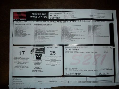 Warning: have a valid man-card before pressing down on these performance driving pedals! This stunning 2005 Saleen S281- car number 191 - is truly impressive and extremely fund to drive! For Mustang fans, it doesn't get much better than hearing Steve Saleen say he's "Reunited with the Saleen brand". The car's super straight body displays a glossy layer of Saleen Silver metallic clearcoat that, judging by its smooth appearance, has been maintained with the utmost care. This car is a 100% accident-free showpiece that's been barely broken in. .... there's essentially nothing on the car that could be considered more than prerequisite shelf wear. So if you're looking for an exclusive muscle car that's impressive, easy to live with, and turns heads at every intersection then bid quickly on this awesome Ford Mustang before you see your buddy put it in his garage! This Saleen is garaged kept by it's original, non-smoking owner and is absolutely like new. This car was purchased from the inside showroom at A.C Collins Chevrolet in Houston TX in July 2005 -- the 1st year of the newly designed Mustang body style makeover by Ford. I have original window sticker, Saleen owners manual, and all literature. The car has not been driven hard and is all stock with no add-ons. I have the title in hand. As we all know, Steve Saleen's creations have never been defined by mere stripes and stickers. Straight from his shop, this Ford's heavily re-engineered 'mod motor' makes a powerful 340 lb./ft. of low-end torque. Visually, the engine compartment comes together just as well as the outside of the car. Saleen's install is exceptionally clean and display the Saleen-branded centerpiece and clean fuel rails. The greatest advancement granted by the new Mustang platform is its ability to corner and handle any track with its Racecraft Suspension. The 5-speed manual drives a tall 3.55 rear end that makes for super responsive wheel spin and alarming acceleration. The modified exhaust system incorporates Saleen's vacuum-actuated mufflers into custom, 2.5 inch stainless pipes. Put all this on top of high-performance Dunlop Tires (275/35ZR20) racked on Saleen's 7-spoke chome alloy wheels (9" in Front/10" in Back) and this coupe is an absolute delight to drive! Inside, you'll find the leather sport seats a nice surprise as you gaze at the 200 MPH speedometer and Ford's "my color" instrument panel. Crank up the Shaker 500 stereo with in-dash 6 CD changer and enjoy all the normal luxuries you'd expect in a high dollar muscle car including: cruise control, power windows, power door locks, power mirrors, a power driver's seat, and remote keyless entry that's complete with built in theft deterrent software. It's always hard to describe a car that is essentially new in every way. So I'll just sum this Mustang up by saying that everything, from its ice cold air conditioning to its Saleen-branded steering wheel, is in impeccable working order. I respond quick to emails and will send additional information and pictures if requested. Ford Base Components Saleen Base Components