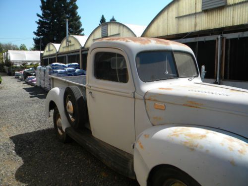 Trusty farm truck for sale: This pickup belonged to an engine builder in Grass Valley California. His personal rig. He rebuilt the engine/transmission/clutch and then fell ill which forced sale to the old fellow I purchased it from in Live Oak California. He rebuilt the brakes/steering/kingpins and installed a new Drake tank as well as went through the cooling system. He owned it "Since the sixties", never registered it and only drove it around on his property. I have owned it for three years and used it to move plants and material around at my nursery. I sneak it out on the road from time to time but have driven it perhaps two hundred miles. I only keep a gallon or two of fuel in it so its fresh. Exterior is in primer and interior is original black. I replaced the grill with new Drake unit and replaced all fluids and installed a new coil. It runs fantastic. Drives great. Breaks work perfect. Transmission and Clutch shift buttery smooth and solid. The body has usual dings and dents but is solid and shows little but surface rust. The floor has been replaced. Hood is from a '41 and has louvers punched. Seat has been redone in green. Bed floor has been removed and replaced with plywood. Tailgate hinges are rusty. Rust at drivers door bottom and a little on passenger as well.Top rust is only thin surface. It is wired to run but that's it. Wood under cab needs replacing to correct stance. Rear bumper is not original. Hood latch is not functional. Lever shocks switched out at some point. I do not know about condition of gauges or lights. Included with sale is brand new set of glass for doors and windshield. Also new set of tail lights. Also included is correct vintage hood latch for forty including "V8" emblems. The truck always starts and runs perfect. It has been my most reliable piece of equipment since I acquired it. I have no paperwork to prove the rebuild, just what I was told by previous owner and the way it runs. I do not have title only Bill of Sale.