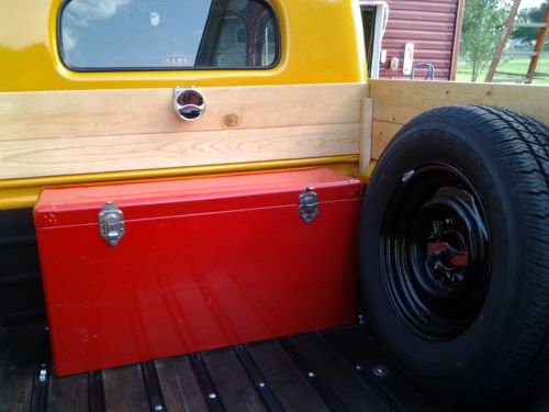 Antique metal box in bed, houses delco battery, jack, wheeel chocks and a lug wrench