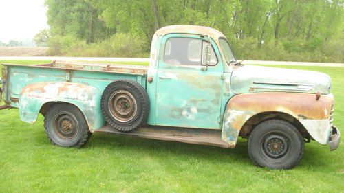 YOU ARE BIDDING ON A 1949 F2 PICKUP, FOR YOU GUYS THAT LIKE ORIGINAL PATINA HERE IT IS!!! I DO HAVE A CLEAR MN TITLE FOR THE TRUCK, NEEDS A LIL MOTOR WORK BUT I HAVE EVERYTHING TO FIX! INCLUDING THE GASKETS! HAS A VERY NICE ORIGINAL INTERIOR, NICE CLEAR GAUGES AND THE ORIGINAL SEAT DOESNT EVEN HAVE A RIP IN IT! SOLID FLOOR PAN WITH SOLID CAB MOUNTS! SHIFT ON FLOOR, GALSS IS NICE N CLEAR, SIDE GLASS DOES HAVE A MINOR CRACK BUT STILL VERY FUCTIONAL! THIS IS A VERY VERY STRAIGHT OL PICKUP! ALSO HAS VERY NICE STAINLESS TRIL AND NICE GRILLE! ROCK SOLID DOORS AND HINGE MOUNT AREA, ALSO SOLID CAB CORNERS, COWL IS ALSO SUPER NICE N SOLID. RUNNING BOARDS DO HAVE SOME RUST. ROLLS NICE N FREELY, HAS NICE ORIGINAL MIRRORS ALSO. THIS 49 WOULD MAKE A PERFECT RESTORATION PROJECT OR A VERY SWEET RAT ROD! ESPECIALLY WITH THE ORIGINAL PATINA! ALSO HAVE A CLEAR MN TITLE!