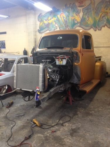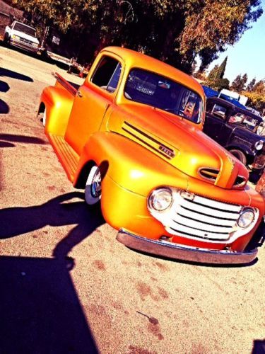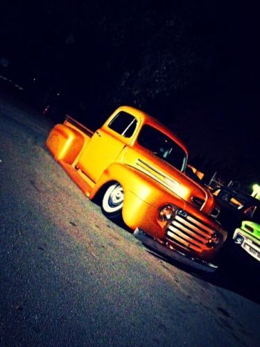 1950 F1 body, chassis and rear end with 3.89 gears Original Wheels painted blue Freshly Rebuilt 302 5.0 mustang V8 engine (caburated not efi) Freshly Rebuilt C4 tranny Lokar Shifter Electronic fuel pump Aftermarket coil Edelbrock intake manifold Edelbrock 650 cfm carburator New Alternator Serpentine belt system Summit Racing Aluminum radiator Napa battery (not optima in picture) Shorty ceramic coated headers Kustom Stainless Steel side exhaust pipes with cherry bombs Heidts Mustang 2 front end IFS with air bags Rack & Pinion steering Power Disc brakes in front (5 x 5.5) Under rail brake booster Drum brakes in Rear (5 x 5.5) Buick hub caps Coker Wide White Wall tires all around G78-15 (90% tread left) Kustom hand made Rear fender skirts (matched paint) Chrome front bumper 1951 Ford Steering wheel Chassis has been boxed in, "C" notched in the rear Air Ride Suspension (Up/down front and back) 5 gallon tank with 480 Viair compressor 4 link rear end Kustom Suede/Satin Copper/Gold tricolor paint job Kustom Coca Cola gas tank (10 gallons) New 12 circuit wiring harness New Lights all around. All lights work and function properly All glass is there with no cracks New Glass Seals for front and rear window Kustom pinstriping front, back and dash New Kustom Gauges (all in working order) New Vintique Rear view mirror Amp with Ipod/connector connector Kustom painted Refurbished Drive in Speakers in cab Linex coated bed Mexican Blanket for seat