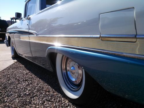 Condition: New paint two tone with base coat and clear coat; New interior upholstery diamond "tuck 'n roll"; New headliner, sun visor, new carpet, new door panels; Upgraded side window glass with tint; Polished chrome front and back bumper and trim; New exterior door handles and mirrors; New side brass cladding stock inlays; New tail lamp lens and front turn signal lens; New Ranchero scrips; 4 New Haligon head lamp bulbs to match original 1958 style; 4 New American Classic 215/75/14 whitewall Radials; Original, pristine condition polished chrome hub caps with New beauty rings; Painted original steel rims; New spray-in bed liner, black; Under body completely refinished; New chrome and stainless interior screw kits; Unaltered interior original dash and radio, speedometer, gauges and trim;