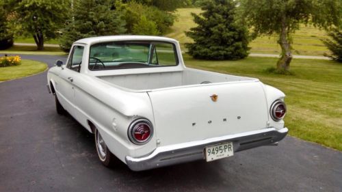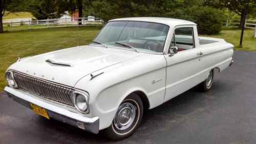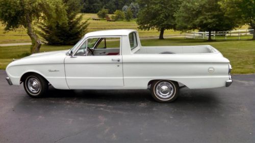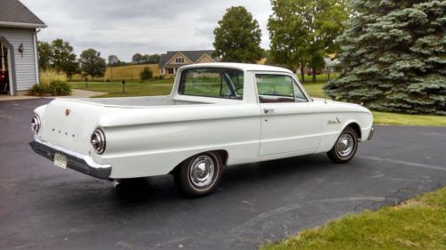 UP FOR SALE IS A 1962 FORD FALCON RANCHERO. CAME FROM ARIZONA 28 YEARS AGO (HAVE THE ARIZONA TITLE IN HAND) AFTER DISASEMBLY, BODY AND FRAME WERE COMPLETELY SAND BLASTED....RED OXIDE ON UNDER SIDE AND EPOXY PRIMER EVERYWHERE ELSE. ENGINE IS COMPLETELY REBUILT HAS APPROX 350 MILES.NEW CARB.NEW CLUTCH,PRESSURE PLATE,THROW OUT BEARING AND RESURFACED FLY WHEEL.NEW AIR CLEANER AND ELEMENT.TRANSMISSION WAS COMPLETELY REBUILT.REAR END CHECKED AND NEW FLUID INSTALLED.COMPLETE NEW EXHAUST SYSTEM.REBUILT GENERATOR,RECORED RADIATOR,NEW HEATER CORE,HEATER BOX AND HOSES.NEW VOLTAGE REGULATOR,NEW STARTER,RECONDITIONED GAS TANK WITH SEALER.NEW FUEL SENDER.ALL NEW BRAKES,DRUMS,HARDWARE,WHEEL CYLS,MASTER CYL AND RUBBER LINES,4 NEW TIRES P175 80R 13 RADIAL WHITE WALLS,NEW FRONT AND REAR GLASS TINTED WITH NEW SEALS,NEW WIPERS AND BLADES,NEW BATTERY,NEW BELT,HOSES AND CLAMPS,NEW FUEL FILTER,NEW RADIO SPEAKER,NEW LETTERS AND FENDER ORNIMENTS,SHOW CHROME ON BOTH BUMPERS,NEW PAINT WIMBLETON WHITE WITH SPRAY ON BED LINER. ALL NEW DELUX RED INTERIOR AND CARPET,DOOR PANELS,NEW KNOBS....CUSTOM TAIL LIGHTS...UNDER SIDE IS RED OXIDE AND COMPLETELY DETAILED (NO UNDER COATING TO HIDE ANYTHING) YOU CAN DRIVE THIS ANYWHERE. HAVE JUST COMPLETED THE RESTORATION OVER THE LAST 3 YEARS.REASON FOR SELLING I'AM AN AIRPLANE MECH AND AM LOOKING FOR AIRPLANE PROJECT CALL DAVE AT 616-262-4369....HAPPY BIDDING!!!-