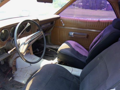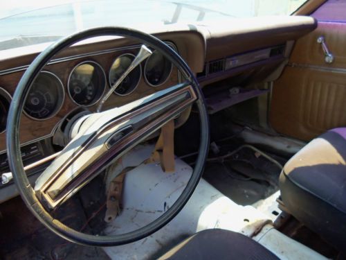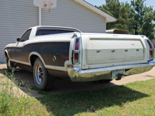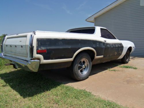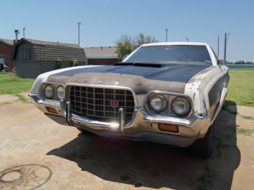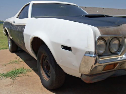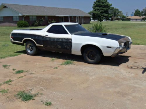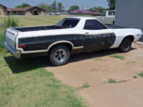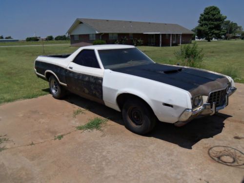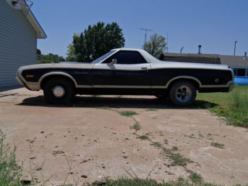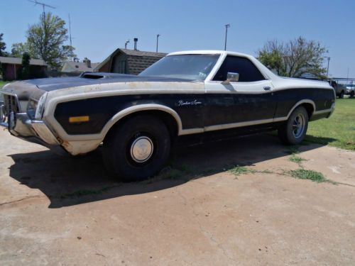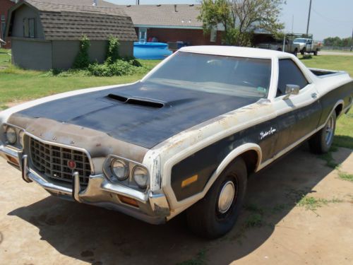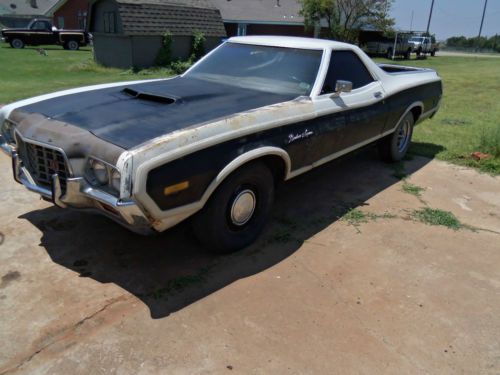 1972 Ford Ranchero Squire, 2 owner, 351c 2barrel car, C4 auto, 3:00 9 inch, power disc, was A/C car, original paint(except the black on hood, black where vinyl woodgrain was, and spray in bedliner), tan interior with black buckets out of a 1990 mustang, very solid car with no rot or rust through, right quarter has a quarter size rust spot starting, insides of door and floor pan solid as is bed. Bought car not running in 2000 off original owner, had been sitting for years, pulled original motor and trans and swapped in another rebuilt 351c, put on new brakes and other various items and daily drove it til 2007 and had a fender bender on right front fender and headlight area, so pulled motor and tranny and put it in my 72 torino, and parked this car. There was no frame damage and just recently put on another fender and headlight assembly, put original motor and trans back in car for selling purposes. car needs motor and trans rebuild but all there except for engine harness for coil and idiot lights. Do not have another squire front pass fender trim or pass lower door trim. Car has a good GT Hood on it. front valance is pretty beat up and grille isn't that great. Windshield is cracked. Car was very solid driver before and didn't walk the road. Was sold new at Malone Ford in Apache Oklahoma and has always been an Oklahoma Car, very dry and solid. Call Brandon with questions at (580)774-9223. Thanks!
