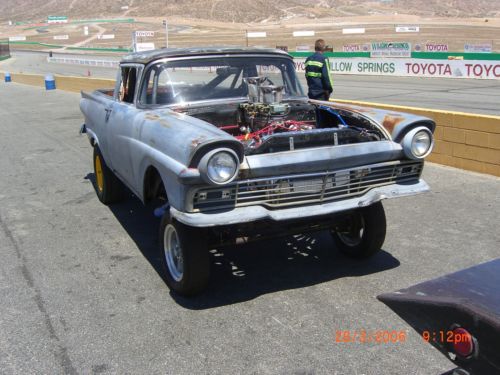 Newly built 57 ford 429 strock to 538 ci offenhauser 360 manifold, custome headers, c6 trans with steel input shaft, lokar shifter. Nice 6 point roll cage with door bar swing out for ease of entry. New sealt belt harness. 457 equi lock differential with cheater slicks. 10 inch by 29.5 inch Fresh fuel ready to go. Ran twice at Willow springs speedway while track was closed so no run times. not street legal. Clear California title in my name.