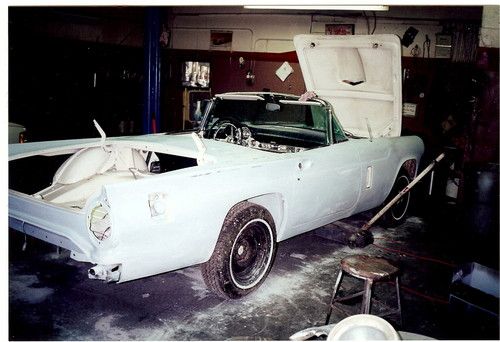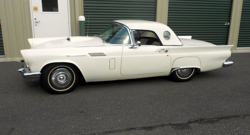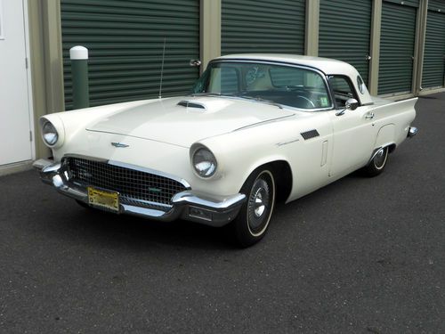 Remember American Graffitti? Here is a beautiful, classic Colonial White 1957 2-seater Ford Thunderbird with a good running 312 cc V-8 engine, automatic transmission, air conditioning, power steering, original hubcaps and fender skirts, and two tops - a matching Colonial White hardtop with portholes, and a black cloth top. The engine was rebuilt in 1997 (with new valves, hardened valve seats, etc.), soon after I bought the car, and power brakes were added; I later upgraded the brake system further to include front disc brakes. The car was stripped to bare metal and repainted its code-correct Colonial White in 1999; I have included a few photos of the repaint process. I replaced the non-working original Thunderbird AM radio with a new Thunderbird AM/FM radio with cassette. The original code-correct black-and-white interior is clean and in great shape. New parts and improvements: fuel line, radial white-wall tires, weatherstripping, springs, voltage regulator, water pump, battery, exhaust system with resonators, expanded radiator, shocks, 6-blade fan and more! The car runs and drives fine and has always been garaged. Title is clear. The odometer reading on the title, when I bought the car in 1997, was 124095, so it has only been driven about 16,000 miles since I bought it, and a bit less since the engine work was done. I have all the bills and receipts for work done, parts purchased, etc., and will include the Thunderbird Shop Manual in the sale, along with some spare parts, and Thunderbird periodicals which include historical and tech tips. I have had lots of Fun, Fun, Fun with this great car over the years, and won trophies with it, but now I need the garage space.