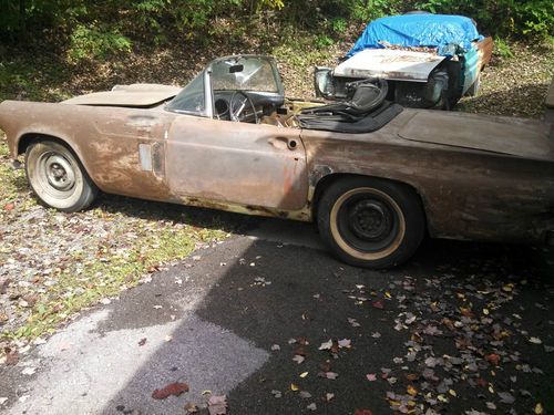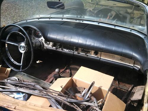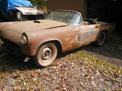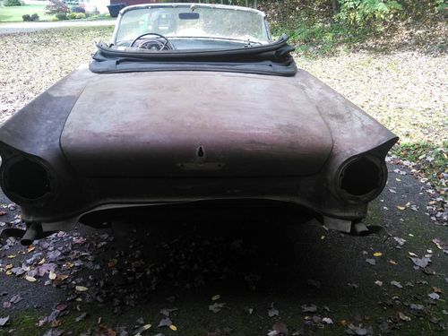 This 1957 Thunderbird was pulled into a body shop in 1969 and taken apart and paint stripped and stayed in heated garage the way you see it in the pictures. I purchased it from estate approx. a year ago with intentions of restoring it. I really don't have the time due to other projects and need the room. Everything appears to be with car except for carb and air cleaner. It is a 312 Bird with a 3 speed trans.This bird is very restorable and has the typical Thunderbird rust of this era. The dash and gauges and Town&Country Radio are in very nice condition. Appears at one time they removed transmission by cutting the hump on the floor so that will need attention. There is a hole on drivers floor and drivers side of trunk floor. Frame appears to be solid with just some scale on it. Rocker will need replaced and there is a pair of rockers for it. There is also some NOS emblems and some other small stuff. Also a new carpet. The top was down all those years behind the seat and is in great condition. I feel some cleaning and some plastic cleaner for back window top would look like new. I DO NOT HAVE THE HARDTOP. Mileage is exempt on title. All glass is with car. Buyer is responsible for shipping. Car or title will not be transferred until all funds clear.I require a $500 deposit within 24hour of auction end!!!! PLEASE DO NOT BID ON THIS THUNDERBIRD IF YOU DONT INTEND TO BUY IT!!!!. ASK WIFE OR WHOEVER FIRST!!! Any questions feel free to call me at 412-629-0458 Thanks and Good Luck!!!