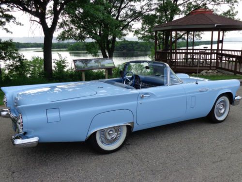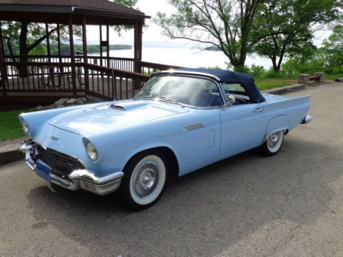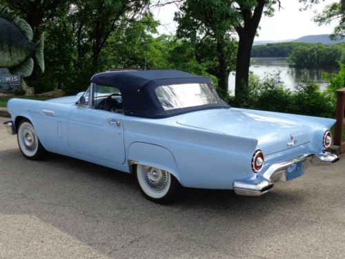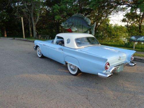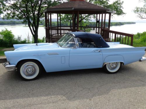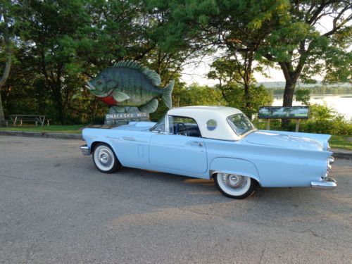 After 26 years of owning , driving and enjoying this car we have decided to sell our 57 Thunderbird. I bought this car from a private party and had it restored in 1988. The restoration was done by a well known Ford restoration shop in St Paul Minnesota. Over the years, all the mechanicals were either rebuilt or replaced as needed, and this included the following: Brakes, exhaust, gas tank , glass, interior, complete body and paint, trim, interior seats , carpet, and door panels. The hardtop and soft top were both restored by Jewels Body Shop in Brillion Wisconsin. The Y-Block V8 engine and Ford-O-Matic transmission perform very well. I do not know the history or actual mileage of either since they were in the car when I purchased it, I have not had to do any repairs to either. The car has always started and run smoothly. Everything on the car is original stock condition with only one exception, we had the radio rebuilt and had the radio shop convert the tuning mechanism to include FM stations. The radio looks completely stock but has the capability to pull in either AM or FM channels. All the other gauges work as they should including the clock! The Wide whitewall radial tires are COKER brand and the battery was replaced last fall. The speedometer reads 21,972 miles. We bought the car in 1988 and at that time the odometer read 89,000. So we have put on about 33,000 miles in 26 years. Most of which was in the first 15 years or so. I kept receipts for the parts and the restoration work that was done on the car and will send along with the car to the new owner.
