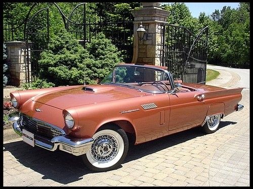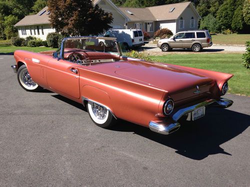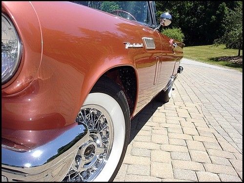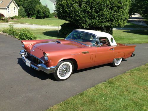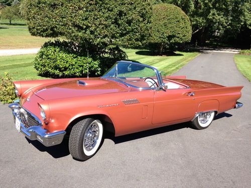 For sale is a beautiful frame off restored 1957 thunderbird. It was professionally restored by Casco.. It has the original build sheet, owner history ( four owners with names), and was an Ohio car for its entire life before I bought it. The color is original - Bronze metallic (Q Color) which you may know is a rare color. The car panel fit is excellent. All chrome, paint, interior and underside are factory new and restored as original. It has the original Town and Country Radio (radio is not working), and 5 full wire wheels with the wide whites. The engine is the correct 312 CID, and looks and runs brand new. The car has the correct type and style battery which is new. A duel master cylinder added which was not stock in 1957. Also added were front disc brakes for your safety!! 2 tops, and hardtop has the round window. Condition of the hardtop is as perfect as the car paint. The soft top is black and also in excellent condition. I've recently had the rubber weatherstrip replaced on the hardtop. All in all a very beautiful car and a multi award winner this summer. The photos paint a pretty clear picture as to the quality level of this car. Inspections welcome. Buyer will pay for shipping, but I can help arrange the shipping. Deposit $500 required before inspection, refundable if inspection is not acceptable to the buyer. Full payment required within 7 days of purchase by cash or bank wire transfer. The car will be shipped after receipt of the payment. This car is sold "as is" and there is no warranty.