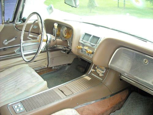 1960 Ford Thunderbird for sale. It has a 352 V8, with three speed Cruise-O-Matic, power steering, brakes, windows, driver seat, and factory A/C. The engine fires right up and sounds very healthy, does not smoke or leak. The transmission appears to shift as it should, and does not leak, but the kick down linkage arm needs to be welded. The power steering works well and does not leak. The radio, A/C, speedometer, horn, fan on heater and a/c do not work. The front windows work slow the rear do not work. The brakes need work before driving on the highway. The body and interior need work. Please look at the pictures carefully, or check out the car in person, before bidding. This car would be a good restoration project. Low reserve for running thunderbird.