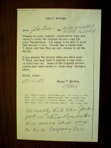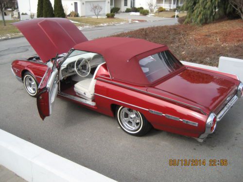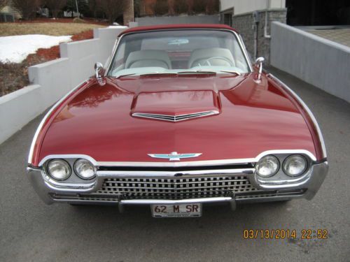 1962 THUNDERBIRD SPORTS ROADSTER ROTISSERI RESTORATION TO TOP QUALITY INVESTMENT GRADE LEVEL CAR HAS WON FIRST PLACE SENIOR AWARD AT 2012 VTCI MEET THIS HIGHLY DOCUMENTED 1962 THUNDERBIRD SPORTS ROADSTER IS THE RESULT OF A NO EXSPENSE SPARED NUT AND BOLT RESTORATION EVERY PART WAS EITHER RESTORED OR REPLACED. FOR ALL PRACTICAL PURPOSES THE CAR HAS BEEN MADE AS NEW OR BETTER THAN NEW IT IS A RARE DOCUMENTED SPORTS ROADSTER. WITH A UNIQUE HISTORY AS A SPECIAL ORDER CAR BY FORD MOTOR COMPANY FOR SPECIAL DUTIES TO BY A SPORTS ROADSTER AND BRING IT TO THIS LEVEL WOULD COST BETWEEN 150K TO 200K THIS CAR IS NOT FOR EVERYONE IT IS FOR ONLY THE MOST SERIOUS AND DISCRIMINATING COLLECTOR OR ENTHUSIASTS THE CAR WAS RESTORED BY A PERFECTIONIST MEMBER OF THE VINTAGE THUNDERBIRD CLUB INTERNATIONAL. AND IMMEDIATELY WON FIRST PLACE SENIOR AWARD IN ITS CLASS IN CHARLESTON SOUTH CCAROLINA. CAR IS 390 ENG WITH TRI POWER ADDED AIR COND POWER EVERTNING. EVERTHING WORKS AS NEW ICE COLD AIR RADIO TOP WINDOWS AND YES EVEN THE CLOCK CAR NEED NOTHING IS READY TO SHOW AND WIN AND DRIVE AND ENJOY IN COMFORT LET YOUR MONEY BRING YOU HAPPINEST. CAR IS SOLD AS-IS-WHERE-IS NO WARRANTY OR GUARANTEES EXSPRESSED OR IMPLIED CAR IS AVAILABLE FOR INSPECTION BY YOU OR THIRD PARTY ON YOUR BEHALF SERIOUS BUYER MAY CALL 570-947-7775 ASK FOR FRED |