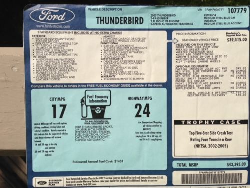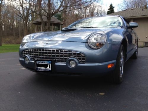 2005 Ford Thunderbird 50th Anniversary Convertible - Hard Top - Soft Top - Optional 2-tone Leather - Chrome Alloy Wheels - As New! - Only 13,511K Miles!! 2005 Ford Thunderbird 2dr Convertible 50th Anniversary (3.9L 8cyl) with Medium Steel Blue Exterior, Optional Black and Blue 2-toned Interior. Loaded with 3.9L V8 Engine, Automatic Transmission, Leather Seats, Power Seats, Heated Seats, Leather Steering Wheel Trim, Cruise Control, Audio Steering Wheel Control, AM/FM/CD Audio System, Power Windows, Power Door Locks, Power Exterior Mirrors, Fog Lights, Chrome Alloy Wheels and more. Original owners car with 13,511 fair weather driven beauty, there are none better available for sale, garage stored always and stored during winter months. No dings, scratches and defects of any kind. The car comes with both tops, the hard top has never been installed and painted in matching Medium Steel Blue with Opera window. Custom cart on wheel stores the top upright and included |