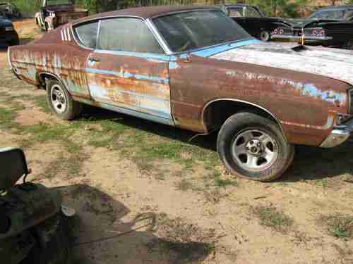 Up for auction is a 1969 Ford Torino GT 428 CJ Q code (non ram-air) automatic car. This car is a major project car but is well worth the time and money. It is a factory 428 CJ automatic on the column car. It was originally a bench seat car but the bench seat was gone when I got the car as well as the running gear. I have a standard 428 motor, a C6 trans with rebuild kit and new R-servo, and a 3:55 posi chunk for the rearend. The paint on the car is Petty Blue. The car has big King Cobra stickers on both right & left fenders. From what I have been able to find out from people that were familiar with the car when it was new is that it was sold as a tribute to this being the only year Richard Petty drove a Ford and a Torino. You should be able to get more information on this with a Marti report. I just have not had the time to do so as I have talked with people around the SC area where the car was sold new. I have a clear SC title for the car and the door tag reads as follows: Body 63F Color _____ (no numbers) Trim 6B Date 17A