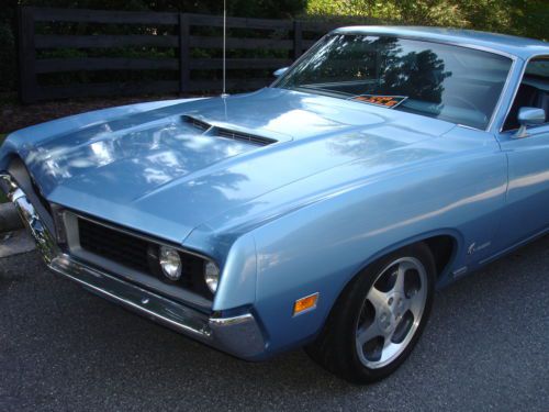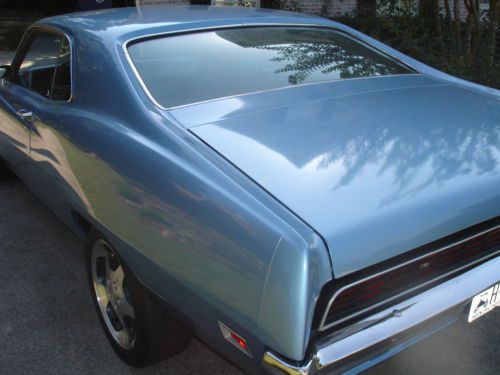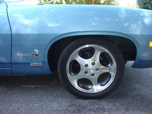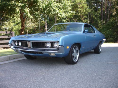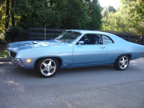 Very clean Original 1970 Torino with factory Ford 351 Cleveland. Factory blue/blue car, all original Docs and tons of CA service records, plus 2 perfect factory buildsheets come with a full binder including the original owners card from Ford, sales invoices copies of titles and owners manuals. Also the car comes with a 1971 grille installed, and the rare original 1970 grille surround pictured with headlight bezels, and trim. Factory GT taillights and a Factory GT hood which were added when it was repainted. I have a new chin spoiler for it I have not installed, and nice new Grant steering wheel for a stronger interior appearance if you like. The hood is Fresh Air when desired, as the ford hood scoop flaps come off/open with removal of 2 screws. All the glass is in very good to good condition without any delamination and all windows roll up and down freely and seal well, no water leaks ever. Car even smells good, not 45 year old stale smelling or musty like most old cars. It has Mustang Cobra 17" tires and wheels pictured plus new rear springs, KYB gas shocks, and a new 1 1/2" rear sway bar, also added when painted and they help make the car handle/corner great. Cobra decals/stickers can be pealed off if desired but look good when seen in person. No rattles or weird vibrations, runs, drives, and stops fantastic. It has the Ford 9" rear and is quiet and cruises the highway at 60-80 all day. New TCI street fighter trans, shifts strong and works perfectly, the factory kick down linkage still intact. Normal shifting trans, not the racing reverse valve body TCI. Brand new dual 2.5 inch exhaust and mufflers are attached to the original manifolds and head pipes which were not rusted out, only 58K documented miles remember. New fuel tank, alternator, and P/S pump. Many new A/C parts were installed and it was working fine for last 3 seasons. Noticed on the last drive to NC. it was still chilly but not as cold as it was, (was 91 and humid) might need a charge, normally very cold. Brakes have new front caliper's, front brake hoses, rear brakes have been serviced too, and it stops great. My family and I use this car sparingly for weekend car shows so it is very safe, reliable, looks great, and is easy to drive. Every blinker, light, and even the door buzzer for the key and dome light works, headliner, door panels, seat covers, headliner visors are still very nice or like new. I recently installed a brand new Holley 750 double pumper with electric choke. It is set up right, hit the gas once to set the choke and it starts cold perfectly, runs strong, no smoke, no engine leaks, no rattles or hesitations. It could use a locking rear to keep from spinning the tires so easily......Dash has one small 1" crack in the middle and it has a dash cover on it now, not glued down, just on there to keep the sun off. Factory radio works....crackles mostly, but will play if you can get a good signal. All in all, good looking paint, with a couple small flaws and ding or nick here and there, but a very nice car that shows well and gets attention. It will, and has won trophy's for us here and there and will get you noticed while getting you home every time...NO rusted areas or body filler to speak of, floor pans and frame rails are perfect.....car was dealer Ziebarted and sold new in CA. did not leave CA until 2008....it was always garaged and many of the original factory marks, stickers, and warning labels are still near perfect and still in place....trunk paint is original, door jams engine compartment paint are untouched. D/S door latch sticks a bit and it may need a door latch soon. Hope you like it, please call me directly if there are any other questions. Thx my cell 949-322-5831 Car is at my home in Alpharetta/Atlanta and can be seen or inspected anytime before close of auction. Car will be held until payments clear....no trades, no checks, no BS please. Bid to own, very fairly priced reserve for the condition, $$ spent on it condition. We are finishing a convertible for the family would like sell this one to fund the conv. This car is faster (with the 351C) and in nicer condition than my 340 Cuda....for a 1/3 of the price!! FYI: I am not a photographer by any means, and I think the gaps are great, body lines are sharp/good, and paint (depth) color shows better in person as my flash usage and the sunlight that day may have distorted lines washed out the blue a bit in photos....