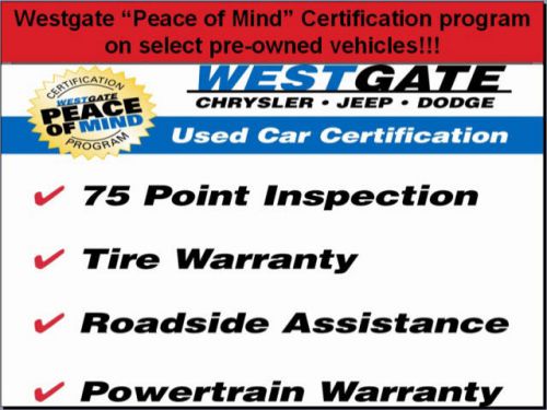 GORGEOUS INSIDE AND OUT, GREAT HISTORY REPORT, LEATHER INTERIOR, LOCAL TRADE!, NON-SMOKER, NOT FROM THE AUCTION, and POWER SUNROOF/MOONROOF!. FOR QUESTIONS OR TO SCHEDULE A TEST DRIVE CALL AND ASK FOR THE INTERNET MANAGER!! * * * PRINT AND PRESENT THIS AD TO JOHN STEELE AT WESTGATE CHRYSLER JEEP DODGE TO TAKE ADVANTAGE OF THIS HASSLE FREE INTERNET PRICE * * * For used car information, please contact our Internet Sales Specialists Josh Tharp @ 888-816-9314.