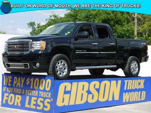 WWW.GIBSONTRUCKWORLD.COM*2012 GMC 2500 Denali Crew Cab Duramax Diesel Allison Transmission 4X4 *Carfax 1 Owner Under full factory warranty, good thru 5/9/15 or 36k miles. Also comes with powertrain and diesel engine warranties, good thru 5/9/17 or 100k miles. Do not make a $3K+ mistake, B4 you buy a used truck demand to see shop bills & have the truck inspected by a 3rd party! Riding on a nice set of Mickey Thompsons, $1,480 DVD player, $1,300 Kenwood navigation/CD player, $470 backup camera & sensors, $350 tonneau cover, $250 power sliding rear window, $120 adjustable pedals, dual power heated/cooled leather seating with memory, woodgrain interior trim, nerf bars, steering wheel controls, tilt steering, cruise control, OnStar, towing package, bed liner, power windows, power mirrors, power door locksSTILL UNDER FACTORY WARRANTY, Gibson Truck World Gibson Truck World in Sanford, FL has the lowest price for used trucks period! Gibson specializes in pre-owned Ford trucks, Dodge trucks, Chevrolet trucks, GMC trucks, Jeeps and SUVs. Gibson Truck World sells, ships trucks across the country & worldwide. We have a large selection of F150, F250, F350, F450, F550, RAM 3500, 2500, 1500 Chevy or GM 3500, 2500, 1500 quality pre-owned pickup trucks.