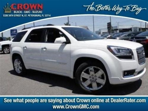 , Before Discount:$52,680.00, Dealer Discount:($2,631.00), Cash Incentive:($1,500.00), Special Discount:($400.00), Internet Price:$48,149.00, Total Savings:($4,531.00)!ALL WHEEL DRIVE, BACK-UP CAMERA, LEATHER, BLIND SPOT MONITOR, BLUETOOTH, MOONROOF, MP3 Player, CHILD LOCKS, 3RD ROW SEAT, KEYLESS ENTRY, HID HEADLIGHTS, SAT RADIO, POWER LIFTGATE, The 2014 GMC Acadia personifies a never say never attitude with its flexible, accommodating space and functionality. Featuring distinctive, bold lines, a confident stance, the Acadia comes with aluminum wheels and automatic on/off headlamps. Body color moldings keep a sleek uniform look. Additionally, there are roof-mounted luggage rails to make family outings as convenient as possible. The interior of the Acadia features attractive trim accents and a soft instrument panel wrap, as well as soothing ambient lighting accents. Additionally, there is underfloor storage behind the flat-folding third row. Rear Park Assist aids by providing audible warning sounds as the rear of the vehicle approaches an object. That, combined with a Rear Vision Camera, makes those complicated parking situations a breeze. A USB port allows you to connect a supported music device for your listening pleasure. All 2014 Acadia models now include two USB ports on the rear of the center console for charging phones and other portable devices. The Acadia is driven by a 3.6L V6 Engine capable of 288 hp at 6300 rpm. Plus, the torque is more than enough to handle a small boat or trailer. The Acadia also affords you the option of a 6-speed AWD automatic transmission or a 6-speed FWD automatic transmission. The dual exhaust allows for an even exhaust flow and are intentionally turned down to prevent any protrusion from the body. The Acadia gives you the extra peace of mind with its host of safety features. An array of air bags protects you from all angles. The StabiliTrak system aids in driving in low traction situations, to keep you in control at all times. The 4-wheel antilock disc brakes grant you the stopping power that you need. Finally, a tire pressure monitoring system keeps you informed via the instrument panel, so you never have to second guess when it is time for a refill. Crown Automotive Group serving Tampa Bay Florida offers great low prices, rebates and incentives for new Group & used Group cars, vans and SUVs to all of our neighbors in St. Petersburg, Largo, Clearwater, and Pinellas Park. Our Expert Service & Parts staff assist our Florida customers keep their Group vehicles in great shape.