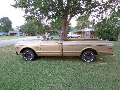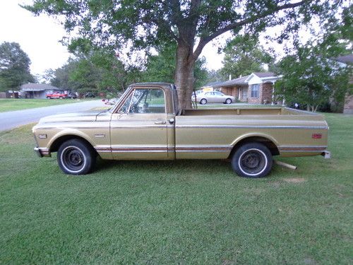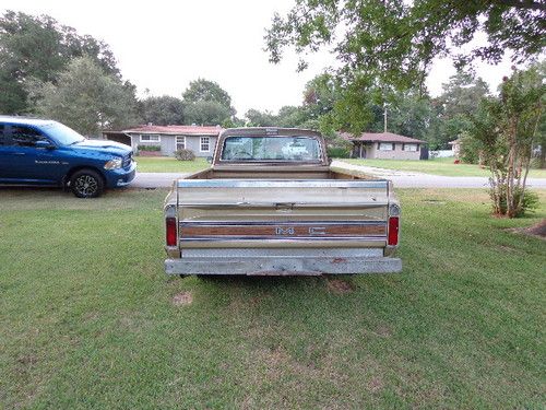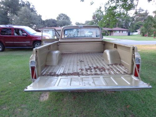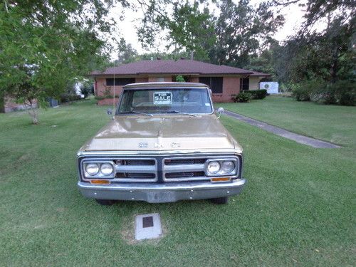 THIS CLASSIC RARE GMC CUSTOM MODEL HAS A REBUILT 350 ORIGINAL BLOCK MOTOR, ALUMINUM INTAKE, HOLLEY CARBERATOR , NEW INTERIOR, ORIGINAL HUBCAPS, PAINT JOB NO DENTS STRAIGHT BODY, ALSO COMES WITH ORIGINAL INTAKE AND CARBERATER THAT WAS REPLACED WITH THE ALUMINUM INTAKE AND HOLLEY CARBERATOR. THE GLOVE BOX DOOR NEEDS TO BE MOUNTED, (I WILL DO THAT} FOR BUYER. BODY CHASIS STRAIGHT AND SMOOTH, INTERIOR REDONE AS WELL AND AS PICS SHOW ALL THE EXTRAS ARE THE ORIGINAL PIECES, ALSO INCLUDED IS THE "G" FOR THE TAILGATE!. READY FOR A GOOD HOME FOR BUYER THAT WANTS TO KEEP THE CLASSIC ORIGIN, OR TO GET RACE SPORT READY. THIS CLASSIC IS A GREAT FIND AND THE MOTOR BALANCED AND BLUEPRINTED RUNS LIKE A TOP!! I LEFT IT IN RAW FORM FOR THE BUYER TO PERSONALIZE. THIS IS A TRUCK THAT WILL LAST GENERATION TO GENERATION!! BID TO OWN IT IS A ONE OF A KIND!! THE PREVIOUS OWNER FOUND IT IN A BARN IN ORANGE, TEXAS. BOUGHT IT AND SPENT HUNDREDS OF HOURS GOING THROUGH to RESTORE IT. IT DESERVES A GOOD HOME!!! THANK YOU. THE MILES I LISTED IM NOT SURE I FORGOT TO WRITE IT DOWN BEFORE I WENT HOME.THE MOTOR HAS LOW HOURS ON IT. THE OWNER DIED AS HE COMPLETED THIS PROJECT, THE TRUCK STILL HAS ORIGINAL A/C COMPONENTS. THIS IS A GREAT TRUCK THANK YOU.