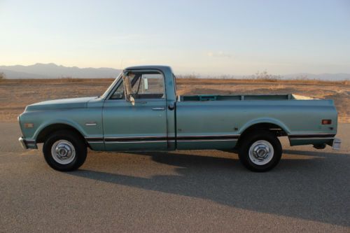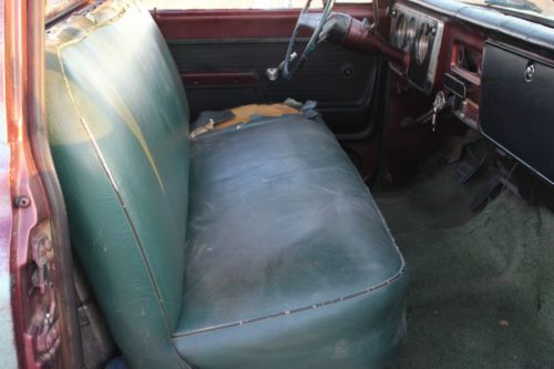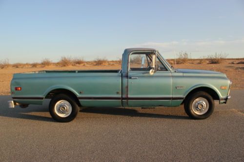 For sale is a 1972 GMC 1500 Custom Longbed. This truck has the rear swing arms, not the leaf springs. The truck fires up and runs great, the motor is solid and healthy, transmission shifts smooth with no issues. Motor and transmission do not leak or burn any fluids, and doesn't overheat. The suspension and brakes are good and it cruises smoothly at all speeds. However, the tires are going to need to be replaced in the near future. Also, small power steering fluid leak, not major, but gives a few drips here and there. The body is great with only one dent on the passengers back of the bed right before the tail light. The interior can use some TLC as you can see in pics. This truck is ready as a driver for whatever purpose or a great base for a restoration. This is a no reserve auction, winning bidder owns it! Truck has a Clean California Title with Current DMV (no back fees). Pre-Smog in California so no smog needed.