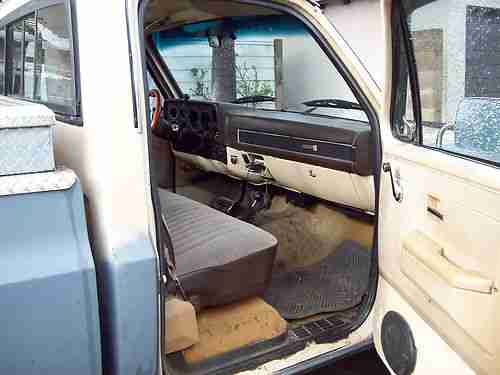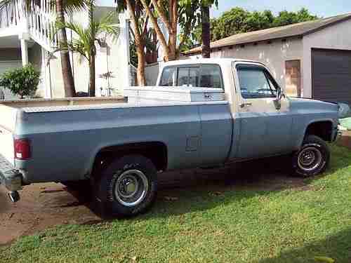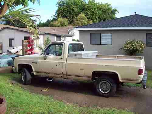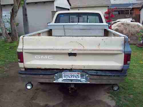 WHAT YOU ARE VIEWING IS ONE 1984 GMC SIERRA 1500 1/2 TON 4X4 TRUCK. IT HAS A 350 CU. IN 5.7 LITER V8 ENGINE AND A 700R AUTOMATIC TRANSMISSION. THIS TRUCK HAS BEEN N THE FAMILY FOR A LONG TIME SO I CAN GIVE IT A GOOD REVIEW. IT IS A VERY RELIABLE TRUCK AND HAS BEEN A DAILY DRIVER UP UNTIL NOW. I AM SELLING THIS TRUCK BECAUSE I NOW HAVE A DIFFERENT VEHICLE AND THIS ONE IS TAKING UP MY PARKING SPACE. IT HAS A BROKEN SIDE VIEW MIRROR AND THE WIPERS SOMETIMES DO NOT WORK, OTHER THEN THAT IT IS A GREAT WORKING TRUCK IN NEED OF A SERIOUS PAINT JOB AND SOME BODY WORK. THE HEAT RISER TUBE AND THE PROPER AIR FILTER HOUSING IS MISSING AND IN NEED TO PASS SMOG. THE TAGS ARE EXSPIRED IN MARCH OF THIS YEAR. TIRES ABOUT 50% WORN. IT HAS SOME CANCER HERE AND THERE. PLEASE LOOK AT THE PICS AND FEEL FREE TO EMAIL MY OR CALL WITH ANY QUESTIONS BEFORE BIDDING. THANK YOU FOR VIEWING. DAVE 310-977-7426.