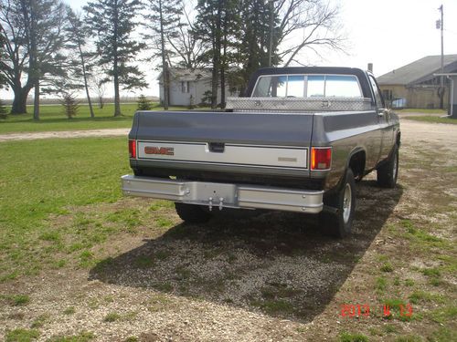 Hello viewers,you are looking at a nice fairly stock 1987 GMC truck that i've had stored away for 12yrs. Ya,i know it sounds crazy,but this is the truth, I am actually the 3rd owner.the I bought this from a local guy whom had purchased a new crate 355 small block,and had the original turbo 400 trans rebuilt,and got in a little over his head on putting it together. I drove by his place often back in the early 2000's,and asked him what he was going to do with it,as i had seen it dismantled for quite a while,and the body looked great,he said he was going to redo it. A couple months later,he came to me,and asked me if i wanted it,as he wanted to get all the money back for the eng/trans,and the fact that the body was nice,so i grabbed it. I put it back together driveline wise quickly,but then had our first child,and the regular cab wasn't going to fly,so it was parked,and just started,and drove around the block and such,just to keep things moving internally,which in my opinion is very important. The engine runs strong,and has excellent oil pressure,shifts well,the four wheel drive works fine,and has new lock outs on it. In the summer of 2012 I pulled it in from the storage building to the shop,sanded it down to bare metal,as they old grey paint was cracking, but the truck really didn't have much for rust,so had repainted it professionally,and had a new windshield installed,and took it to the local exhaust shop,and had new duals put on it,all the way out the back sides. It has a nice diamondplate toolbox in it. This truck is the first year of fuel inj,as i know of,and has had 2 new inj already installed,a new fuel tank,and pump. The only things that i can think of that may need addressed are- the fuel gauge isn't always accurate,the cruise control is Not hooked up,as i never got the components from him,and the tires that are on it are so/so,but already bought a nice set of 4 matching GOOD YEAR 31/10.50/15'S, and HAVE MOUNTED THEM SINCE PHOTO. These are the factory aluminum wheels in pics,and the original spare is still under the bed . The frame was cleaned,and painted when the bed was off,and the underside of the bed was repainted also. This truck has never been jacked up,or hacked up,it is as said fairly stock,bt looks very nice,and drives well,and i encourage a viewer to look at it in person,or send someone to view. This truck is used,and 25yrs old,so i DO NOT IMPLY ANY TYPE OF WARRANTY,it is exactly what i am explaining,and if you wish for additional pics,or info,please ask. I have about $11,000 in this jewel,and know i won't get it back,but will expect to get something,or it will just go back into storage until my next midlife crisis. Now down to bidding,or offers,as said,would like you,or someone to check it out,if not keep in mind,out of all these yrs,it has been drove only to the exhaust shop,and my daughters school,so don't make an offer unless your serious. This is a NON A/C TRUCK ALSO. IF you bid,and i accept,i wish to have a $500.00 deposit through paypal,and the rest in cash,or good bank money order within 3 days,unless prior spoke of. Thank you for viewing,and please ask ?'s if needed,- and if your wondering if i take partial trades= only if it's a kool pontiac,or chevy,thanks folks