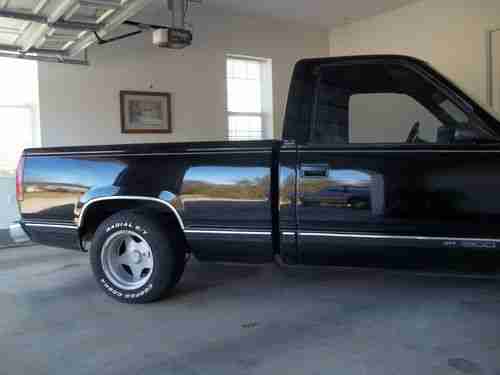 The exterior of the truck is black. The paint on the sides of the truck is pretty good common scratches and common wear on it. The roof of the truck paint is dull, the inside of the bed is scratched up, but not dented up. Inside of the bed, the roof, and the hood could use some new paint. It has sporty carbon fiber mirrors. This is a rust free truck, you got to love a GM product from the south. The tires on the truck are very wide and very deep in tread 85% All 4 of them are matching. The truck has a 2 inch drop on the front and a 3 inch drop on the back, so its sits beautiful. It rides very smooth for a lowered truck.