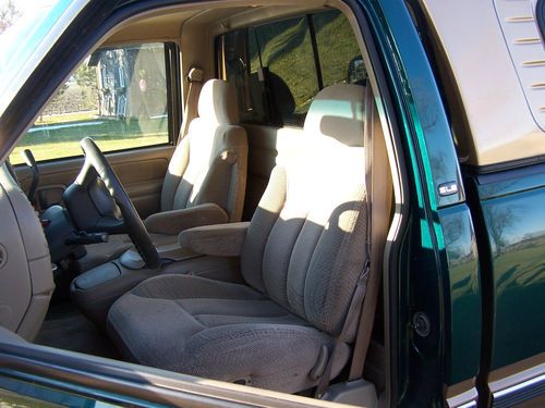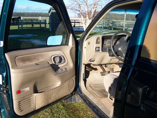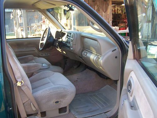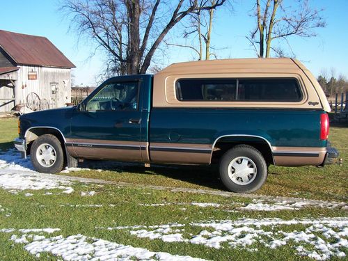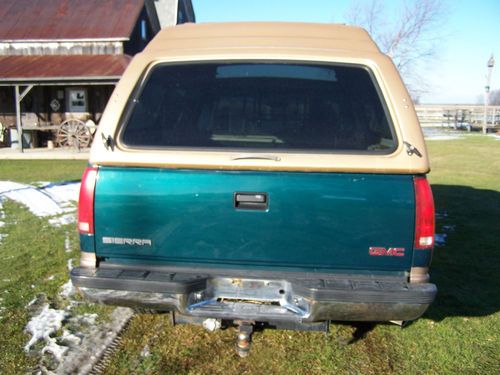 Up for sale is our 1998 GMC Sierra Pickup truck. Main color is dark green with Tan lower panels and tan interior. This is a regular truck with 8 ft. box. The box has a liner and a camper shell. It does have a towing package on it with a transmission cooler. Still runs good just has too many miles on it for us to travel. We drove it everyday up until we purchased a new truck in January. It hasn't been drove all winter. We did start it up periodically. Had the oil changed every 3000 miles. Was very well taken care of. Since we have had it the last 10 years we have replaced the starter, alternator, fuel pump, transmission was pumped and new oil put in it, new brakes, new universal joint, new intake gaskets and regular maintenance. Just recently we found that it has a hard time starting when it's raining. (distributor cap I thing) When it dries out it starts fine.