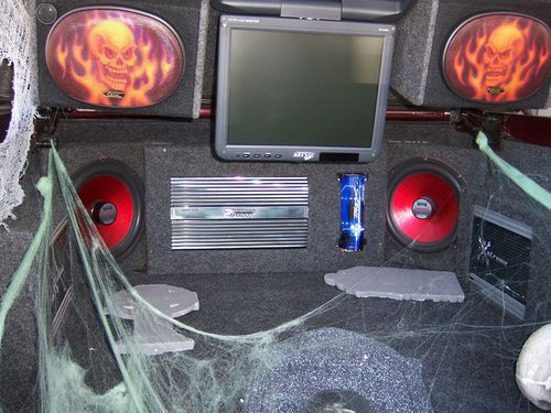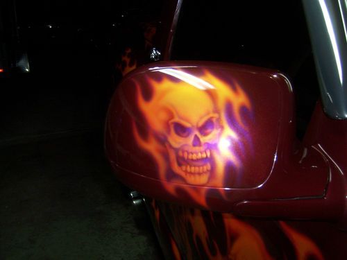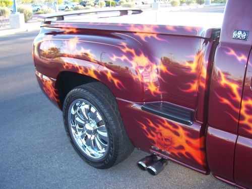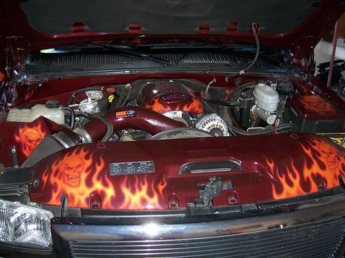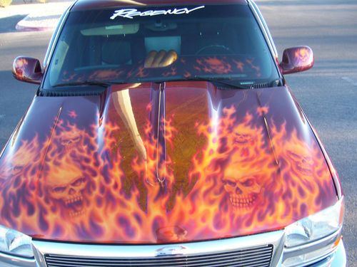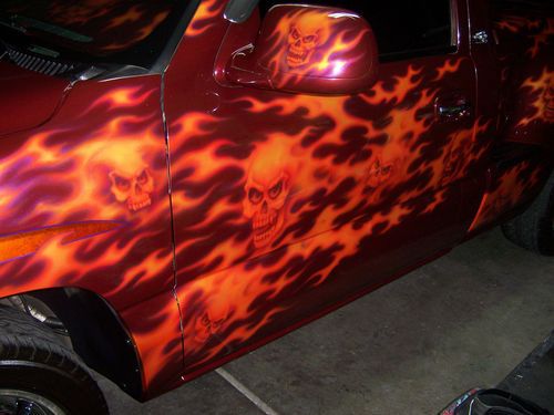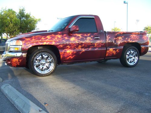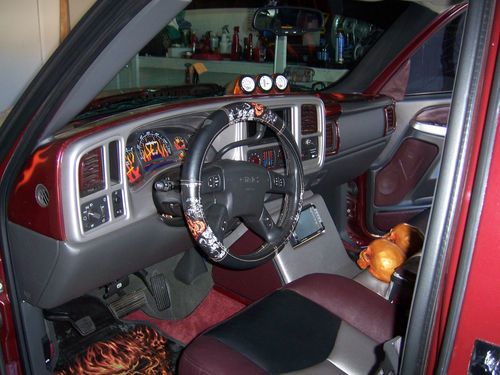 2003 GMC Sierra Regency show truck only 39,766 miles. Must see to really appreciate the paint job! Skulls and Flames are the theme of this truck. Airbrushed mural on the tailgate, over $15,000 in the paint job alone! 20 in. rims and tires that have 90% tread left. Snug top,also painted to match. Inside the bed are three T.V's, two 12 in. subs, amplifiers, speakers, everything you need at the car show. The interior has been totally re-done to match the exterior with a painted and airbrushed dash, custom door panels wrapped in leather, with tv screens in them, dvd player, leather seats/console. Adult owned, always garaged, One owner....