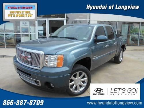 2011 GMC Sierra 1500 AWD Crew Cab 143.5 Denali Hyundai of Longview presents this CARFAX 1 Owner 2011 GMC SIERRA 1500 AWD Crew Cab 143.5 Denali with just 85967 miles. Represented in BLUE. Under the hood you will find the 6.2L V8 16V MPFI OHV Flexible Fuel coupled with the AUTOMATIC. Options and Safety Features: Nicely equipped with Air bags frontal driver and right-front passenger with Passenger Sensing System (Always use safety belts and the correct child restraints for your child's age and size even in vehicles equipped with air bags. Children are safer when properly secured in a rear seat in the appropriate infant child or booster seat. See the Owner's Manual and child safety seat instructions for more safety information.) Air bags head curtain side-impact front and rear outboard seating positions with rollover sensor (Head curtain side air bags are designed to help reduce the risk of head and neck injuries to front and rear seat outboard occupants on the near side of certain side-impact collisions. Always use safety belts and the correct child restraints for your child's age and size even in vehicles equipped with air bags. Children are safer when properly secured in a rear seat in the appropriate infant child or booster seat. See the Owner's Manual and child safety seat instructions for more safety information.) Air bags seat-mounted side-impact driver and right-front passenger for thorax and pelvic protection (Always use safety belts and the correct child restraints for your child's age and size even in vehicles equipped with air bags. Children are safer when properly secured in a rear seat in the appropriate infant child or booster seat. See the Owner's Manual and child safety seat instructions for more safety information.) Automatic Crash Response Daytime Running Lamps with automatic exterior lamp control Door locks rear child security. (Crew Cab models only.) Rear Parking Assist Ultrasonic with audible warning StabiliTrak stability control system "You pick it out and We'll work it out!"