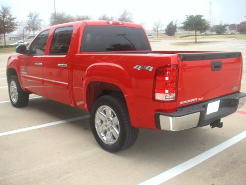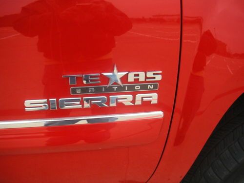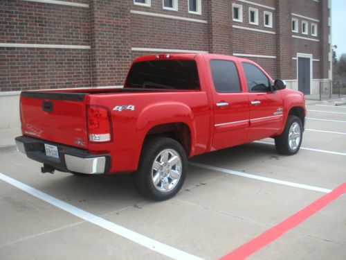 For sale is a beautiful 2013 one owner, Red GMC Sierra 1500 4WD Crew Cab SLE with only 14856 miles. This Texas Edition comes with Vortec 5.3L V8 engine with Active Fuel Management, 6-speed automatic transmission, HD trailering equipment pkg., 20" chrome clad wheels, locking tailgate, EZ Lift tailgate, 6 way power seat adjuster-driver, auto dual zone AC, steering wheel radio controls, CD player with USB port, Bluetooth for phone, fog lamps, chrome door handles & mirror caps, tilt steering, tinted glass and skid plate pkg. MPG 15 city and 21 highway. Drives great, quiet, no rattles. Owner a got a new job that came with a company car, so he needs to sell this truck. The owner is a friend of mine and asked me if I would sell his truck as he is going to be traveling a lot on his new job. The truck is in Plano, TX. Send me an email if you have any questions and thanks for looking.