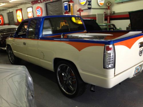 excellent truck runs awesome sounds really good running freshly built 350 5.7 bored .60 over 480 lift lunati cam, cast iron .202 heads Holley 650 carb headers etc. etc.... lots of other extras under the hood including fully painted to match truck custom built interior built out of fiberglass with auto meter gauges custom bucket seats that have been wrapped in blue and white sued 2 15" audiobahn eternal 1500 watt subs a digital designs dd 3000 watt amp to push subs also a 1500 watt audiobahn 4 channel amp for mids and highs witch include at this time 6-6" mids and 2-8" mids fiberglass custom built box with 2 ports measuring 3x5 approx.. 24" hypnotic wheels with 50 percent tread on lexani tires 411 gears in rear end interior also includes Plexiglas in door panels and is set up for electric door poppers. there is many more things on this truck that I am forgetting but you can see in pictures all this truck needs is a center console finish built it is half way done and have all stuff necessary to finish also could use a better fuel pump it still has factory pump only putting out about 3 pounds of pressure witch is cutting down power performance on long wide open throttle runs, it could also use a fresh paint job the paint that is on it now looks excellent but has chips and dings and small cracks the color scheme is not the most desirable but can always be changed other than that truck is excellent was my truck all through high school and is adored by me but is no longer easy to use having a family so please contact with any questions or concerns