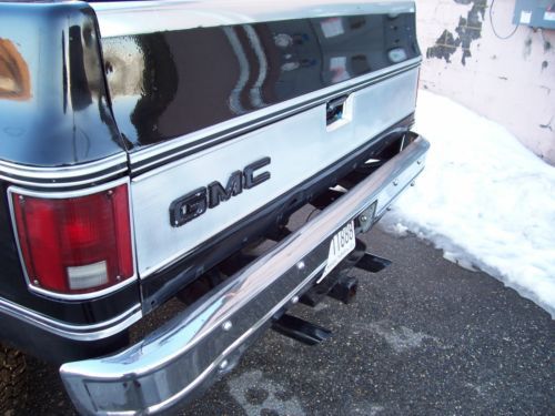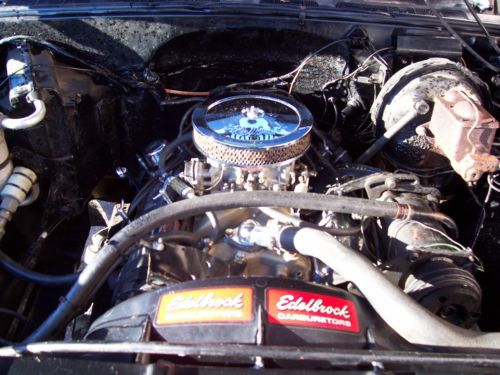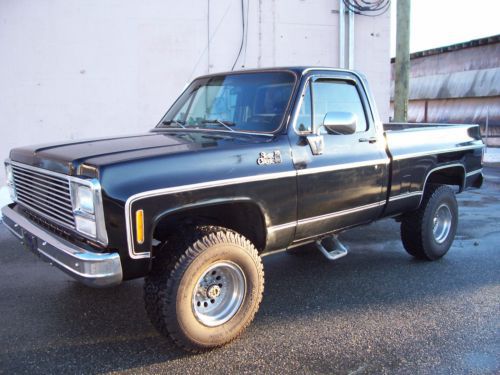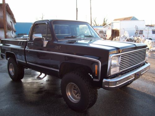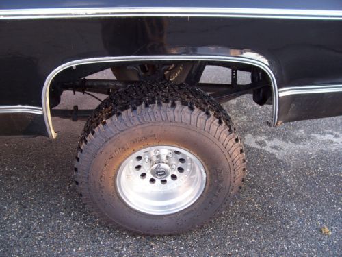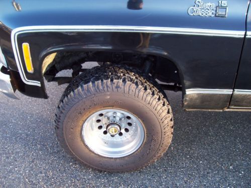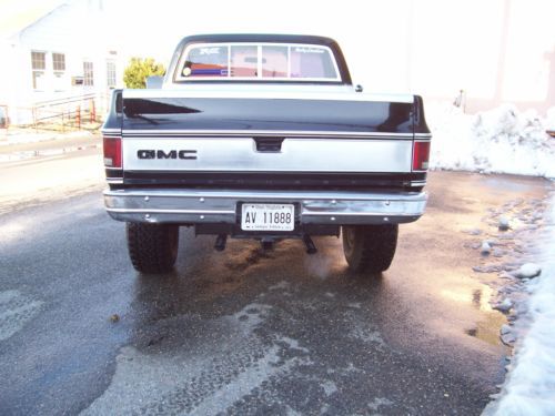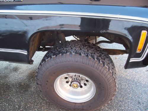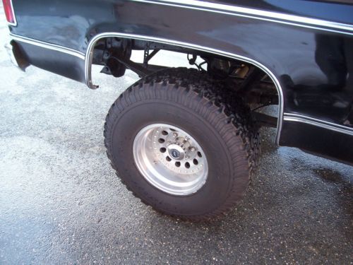 1980 Black on Black GMC K1500 4x4 350 V8 engine was replaced with new crate motor 275hp less 1500 miles April of 2008 Edelbrock Carb,intake,valve covers ,timing chain cover, Headers w/ glass packs. Power brakes,steering,cold ac and dual fuel tanks. Kenwood 4 speaker sound system. Sliding rear glass. New last summer upper and lower ball joints.tied rod and stablelizer shock replaced with frontend alignment @ Goodyear. 350 turbo trans with B/M kit/ into transfer case with 3.73 gears front and rear. 15x10 American Racing Outlaw wheels wit brand new BF Goodrich Baja Radials. Solid frame and Bed with the normal rust under the doors and bottoms of the front fenders. Over all truck is in good condition in need of little bodywork and a fresh paint job. Truck has been stored inside 90% of the time since owned. Runs and Drives good and is attention getter when ever we get it out. Cool weekend cruzer! |