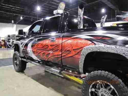 Accesories added - 6" suspension lift, 37" tires, 20" rims, vent visors, mirrors, cowl hood, cold air intake, fender flares, all new shocks - 8 in total, step bars, tonneau cover, exhaust stacks, LED tail lights, projection headlights, grill, wrap, emergency & snow light bar ( white/blue & included amber lenses, turns white to amber), back up camera, 2X 10" drop hitches - 1 has a 2" ball the other has a 2 5/16" ball and an electric brake controller.