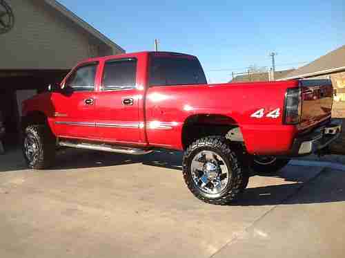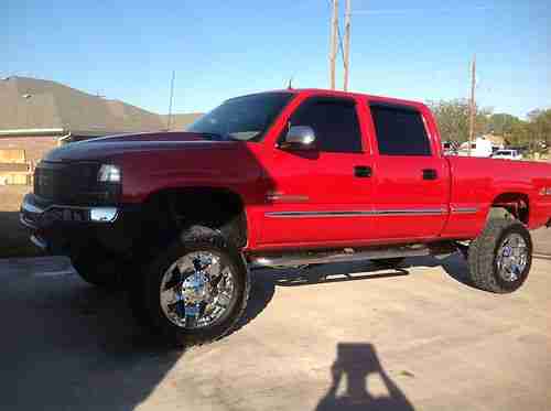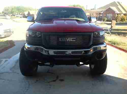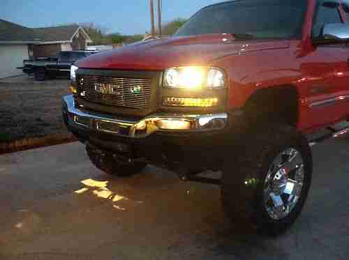 5-speed Automatic Allison Transmission with very strong and dependable 6.6L Duramax Diesel. Projector Headlights w/ blue Halos, LED Turn Signals, Euro Blacked Out Taillights, & 3rd Brake Light, Painted Fiberglass STS Flush Mount Bed Cover. Truck is a 2002 GMC Sierra 2500HD Duramax with 2007 GMC Sierra Front End Conversion, No Gap Between Bumper & Grill -- lots of custom work, T-REX GMC Billet Emblem, Trenz Billet Grill, Billet Bumper Inserts, Halo Fog Lamps, 2.5" Steel Cowl Induction Hood, K&N Fuel Injection Performance Kit, Chrome Door Handle Covers, Dual 12" Aluminum Audiobahn Subwoofers w/ 1000 Watt Audiobahn Amp, Panasonic Stereo/MP3 Player, Heated Leather, Color Matched Spray-In Bed Liner, ECU Programmed Custom Tuned W/ EFI Live for Overall Mileage/Power, Electronic Trailer Brake Controller, Heater Will Make You Sweat, Perfect Ice Cold A/C for the Summer, Brand New 6" RCX Lift Kit with XD Chrome Rockstar 20x10" Rims with 35" Federal Couragia Tires - 90% Tread. Beautiful GM Red with Chrome Accents; Show Truck. It Has Been Babied! Fuel Injectors Replaced At 100K. Highway Miles Only. Truck Is Just Now Being Broke In. Never Taken Off Road, Clean Undercarriage. Lots of Horse Power, High Torque, Fast Engine. Brand New Diamond Eye 4" Turbo Back Exhaust W/ 5" Chrome Tip, Chrome Bully Nerf Bars, 5% Limo Tint All Around Including Brow. Awesome Sound System! Everything was Professionally Installed, Oil Changed Every 3,000, Includes Hitch, New Shocks W/ Red Boot Covers, And Lift; Well Over $30,000 Invested. Heated Leather, Alarm System, On Star, 2003-2007 Front End Conversion, Paintable Bumper And Grill. Rain Guards, Tow Hooks, Too Much To List. Truck is a Real Head Turner! In very good condition. there are a few paint blemishes but areas have been touched-up. Very minor dent in bottom back right near rear bumper. Driver's seat bottom will need new cover soon. Normal wear and tear for 13 year old vehicle. I Hate to Get Rid of it but I need to pay some bills off. I still have the original sells sticker & manual (over $43,000) -- Price was With All Options For SLT: leather, heated seats, etc. Clear Title. Vin# 1GTHK23152F144866. I am the third owner. First and second owners were elderly and took very well care of truck. Must Sell Fast! Truck Currently Has 181K Miles But Will Last Over 1,000,000 Miles With Continued Scheduled Maintenance. Please ask if there are further questions.