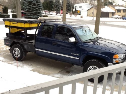 2000 GMC Sierra 2500 Flatbed Service Truck. This is a very well equipped truck with a 6.0 liter engine heavy duty trans w/ temp gauge. Other features include A/C, dual heated leather seat. Driver seat has small rip in the seam which is stitched right now. Dual power seats that go in every direction. Rear full leather bench seat. AM/FM after market, Apple Ready, iHeart, Pandora, Blue Tooth stereo. Cruise control. Newer electronic push button 4x4. Wired for amp. Possible Power rear sliding window. Power locks/windows. Direct power to the battery on the back bed. Addition power is wired up with switches in the cab for light bar on top of the truck. LED rear flood light. New transfer case and transfer case motor. New rear axle. New paint job with all new cab corners and rockers everywhere. It has 223000 miles on it right now and is driving very nice. It has had excellent maintenance. I just built the bed about 3+ yrs ago; It is very heavy duty with ibeam construction and will outlast your next three trucks. It has all LED lights thru out the flatbed. Newer tires and custom rims. Hitch. Wired up for salting.