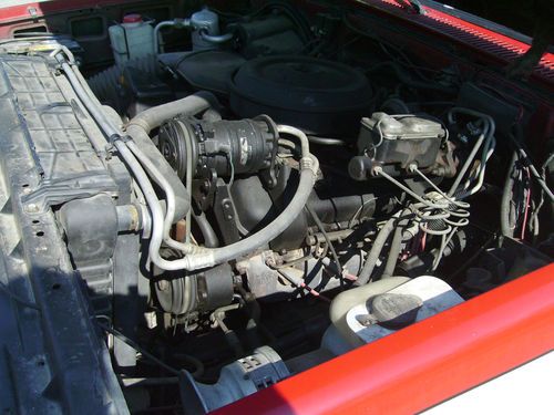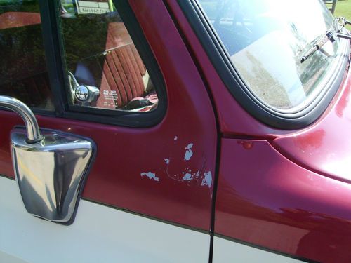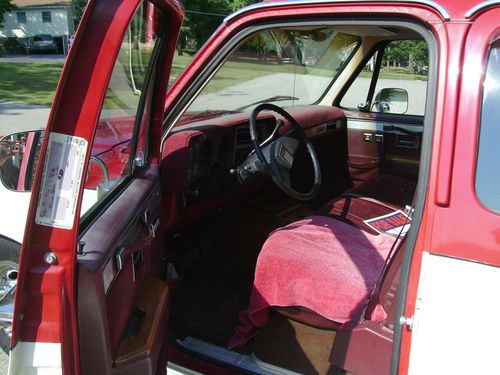 Wife's personal ride since 1995,She says its time to sell) factory dk red over Wimbleton White paint(silver bottom started peeling in '94)From So. Ca. and now in So Mo. has NEVER been driven in winter snow/ice or early spring while here. NO RUST EVER!!!! Lowered with "Bell-Tech" parts,spindles/springs on fr. and short stack with shackles and hanger relocatoin on rear.(rides nice) runs good with 139k on truck and 40k on rb t-400 from Riverside, Ca GMC dealer, 454 v-8 t/b p/s,p/b,p/w,p/dl,a/c,auto,etc.tube grill, rear step bumper,6 NEW(1000mi.) tires,int. mostly orig. in burgandy, newer off white headliner with mahogany o/h console and matching floor con. and arm rest,orig.rear fenders. paint starting to show age. front seat cloth insert worn, rear starting to show as well, body is straight but has norm gravel pitting and minor chips. Truck is listed for sale or trade (Harley) locally as well.For more info or details you can save time and call my personal cell, 417-349-1668. Rex Allen