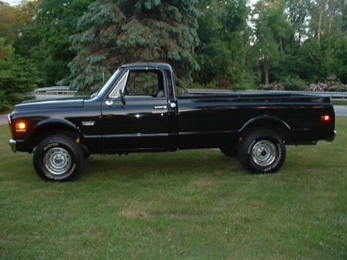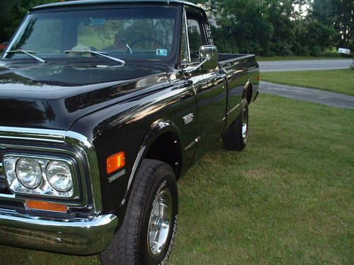 selling my 1970 gmc 4x4 1500 truck,frame on restored about 4 years ago.drive tran rebuilt,new brakes,radiator,shocks,tires,belts,hoses,all chrome,all new interior.only rust on body is on bottom of drivers door as seen in pictures.truck has power drum brakes and no power steering and no air conditioning.four wheel drive works good and truck drives good.buyer to pay cash in person.local pick up only.any questions please contact me.if you have zero feedback please contact me before bidding.