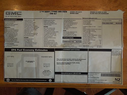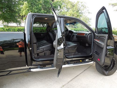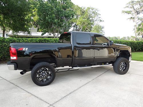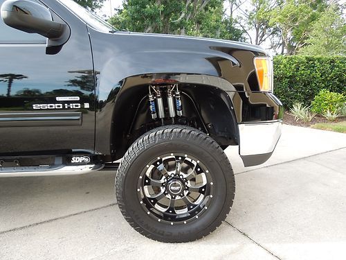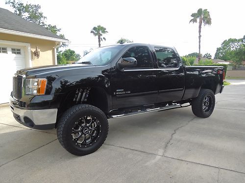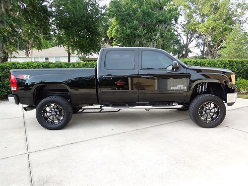 2009 GMC Sierra, 2500HD, 6.6L Diesel, Z71 crew cab fully loaded with SLT trim package, 24,500 miles. Black exterior with black leather interior, power heated seats, remote start, navigation system, back-up camera, blue tooth, Onstar, HomeLink and tow package. 4" lift, 20x9 BMF Novakane rims, 305 Toyo Open Country tires, Cognito heavy duty tie rods, Cognito steering brace kit, Kryptonite Xtreme Idler Support and bracket, Cognito custom traction bars, Mag-Hytec differential cover, Cognito upper control arms and dual front shock kit, Fox remote reservoir shocks (duals in front), tinted windows, Line-X bed liner and black billet grill. SDP S475 twin turbo kit installed by Duraburb Inc, Banks intercooler and boost tube, Air Dog 165 lift pump/fuel filtration system with pressure gauge, 4" MBRP turbo back exhaust, performance built transmission by Pro Trans of Central Florida, EFI Live with DSP5 switch, Tuning by ATP (Idaho Rob), Edge CTS insight monitor. All suspension work on truck has been done by Jeepers Den Orlando. Includes all stock parts necessary to remove twin turbo kit and return to stock configuration if so desired. Also includes stock exhaust components (i.e. cat converter and DPF) to convert back to stock exhaust if so desired. Truck is rarely driven and in emaculant condition.