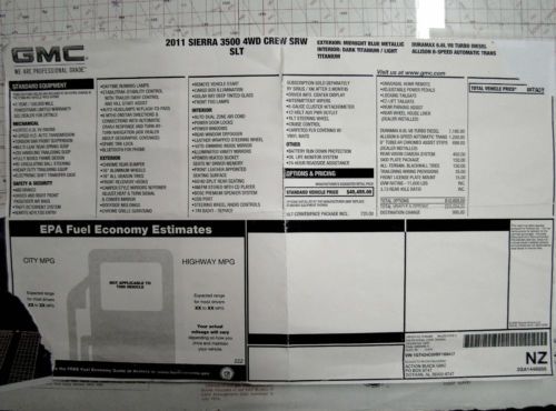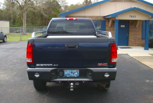 My truck was purchased new and I am the original owner. There have been no smokers or pets in the truck. It has been properly maintained (all service records available) and is in very good condition both mechanically and in appearance. It has all standard features for the 2011 GMC 3500 HD 4X4 SLT Single Rear Wheel truck (original window sticker in photos). It has running boards, spray-in bed-liner, 8' bed with SS rails, is midnight blue metallic with titanium gray leather interior. It has a Buck Stop heavy duty rear bumper with PIA high intensity back up lights installed.