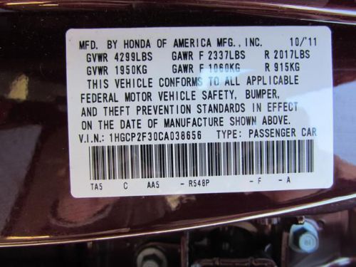 VIN (Vehicle Identification Number): 1HGCP2F30CA038656